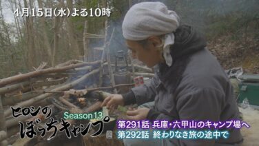 「ヒロシのぼっちキャンプ Season13」 4/15(水)よる10時は・・・ 第291話・292話「兵庫・六甲山のキャンプ場へ」「終わりなき旅の途中で」 厳冬の兵庫・六甲山へ。 道中のスーパーで見つけたマッチを手に、ヒロシが辿り着いたのは...